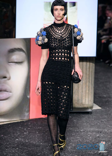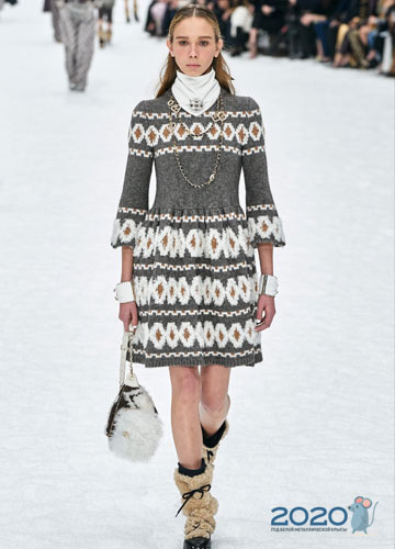 Dies kann ein stilvolles Kleid aus großen Strickwaren sein, ein Farbmodell mit geometrischen Mustern wie in der Chanel-Kollektion oder ein modisches handgemachtes, fein gehäkeltes Kleid.