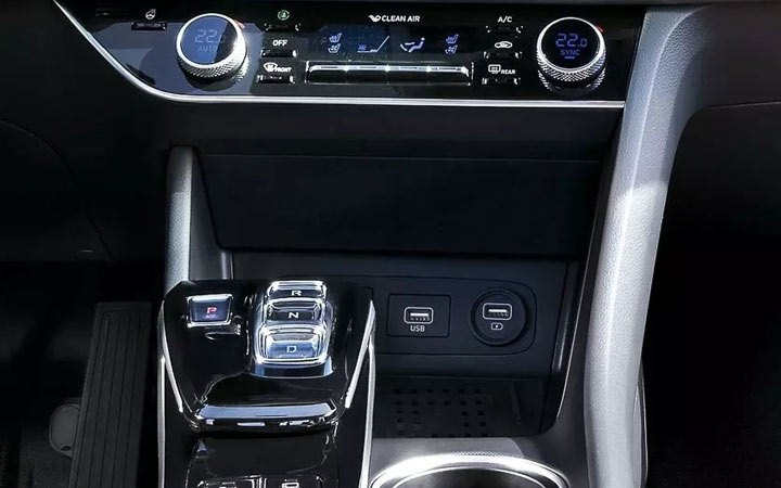 An der Unterseite der Mittelkonsole befinden sich zwei sich verjüngende Kanäle.Das Klimabedienfeld ist mit neuen runden Wahlschaltern ausgestattet. Am Übergang der Konsole in den Mitteltunnel befinden sich ein kabelloses Laden, mehrere USB-Anschlüsse sowie eine 220-V-Steckdose. In der Nähe des Schaltknaufs befinden sich eine Wahltaste und zwei Getränkehalter, in denen Sie Getränke aufwärmen und abkühlen können.
