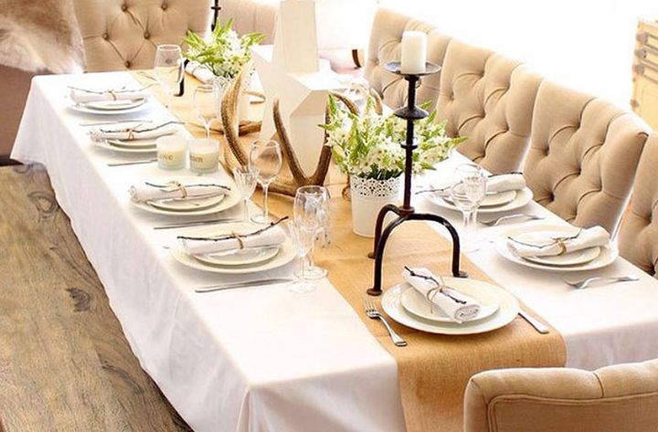 Bei der Auswahl einer Tischdecke sollten Sie natürliche Stoffe bevorzugen: Leinen oder Baumwolle. Trotz der Tatsache, dass die Pflege problematisch sein kann (sie zerknittern, können nach dem Waschen abnehmen), sehen diese Stoffe auf dem Feiertagstisch gut aus und fühlen sich angenehm an.