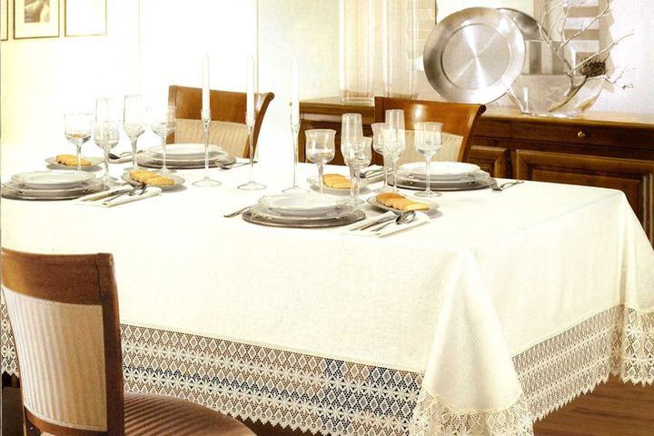 Traditionell wird für Feierlichkeiten eine schneeweiße Tischdecke verwendet. Es kann mit leichter Stickerei oder Spitze verziert werden. Die schneeweiße Tischdecke ist universell einsetzbar - am einfachsten lässt sich ein Dekor dafür auswählen, da fast jeder Schatten dafür geeignet ist. Darüber hinaus passt es gut in das Innere des Raumes und macht es raffinierter.