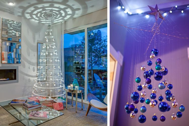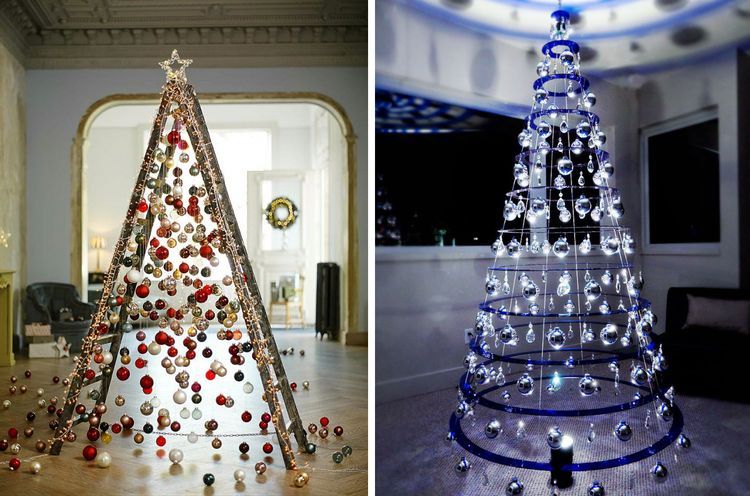 Eine Alternative zu Wandkonstruktionen sind voluminöse Imitationen von festlicher Fichte. Dies ist ein weiterer Modetrend - Spielzeug in der Form eines Neujahrsbaums, aber ohne. Die Stütze kann alles sein: von einem transparenten Netz von einer Angelschnur bis zu einer Klappleiter. Die Innovation wurde bereits als "unsichtbarer Weihnachtsbaum" bezeichnet und wird erfolgreich zur Dekoration von Schaufenstern oder Innenräumen verwendet.