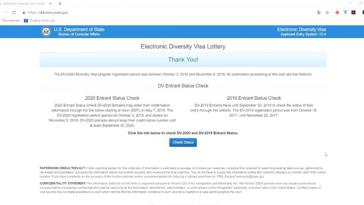 Die Einreichung eines Antrags auf Teilnahme an der Verlosung ist jedoch nur die halbe Miete. Außerdem muss eine Person in der Zeit vom 7. Mai 2019 bis 30. September 2020 regelmäßig auf die offizielle Website des US-Außenministeriums gehen und auf der Seite nach unten zur Schaltfläche „Status prüfen“ scrollen. Hier müssen Sie immer wieder die erforderlichen Informationen eingeben: die Bestätigungsnummer, die dem Teilnehmer unmittelbar nach dem Ausfüllen des Erstantrags ausgehändigt wird, seinen Nachnamen und sein Geburtsdatum. Nur so kann jemand eine Antwort auf die Frage bekommen, ob er zu den glücklichen Besitzern der begehrten Green Card gehört oder ob das System, das die Gewinner der Lotterie 2020 in willkürlicher Reihenfolge auswählt, ihn diesmal umgangen hat. Es ist wichtig, dass Sie das Verfahren zur Überprüfung des Status Ihrer Bewerbung wiederholt wiederholen. Wenn einer der Gewinner den Gewinn verweigert, wird sein Zertifikat erneut unter den Teilnehmern verlost.