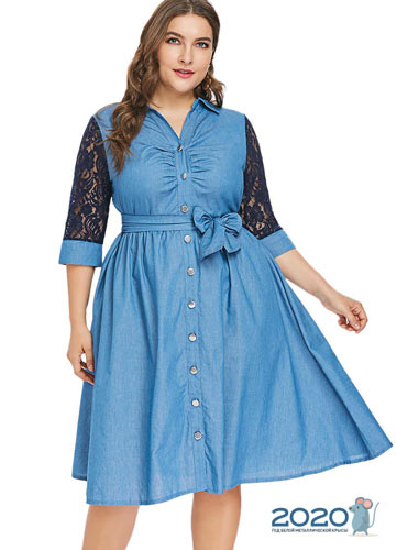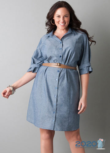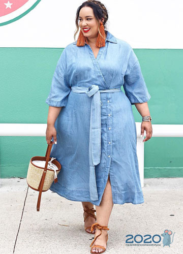 Im Zuge des Interesses an der Mode der 90er Jahre sind Jeanskleider verschiedener Stile in der Saison Frühjahr-Sommer 2019 bei übergewichtigen Frauen sehr beliebt geworden, wie auf dem Foto zu sehen ist: