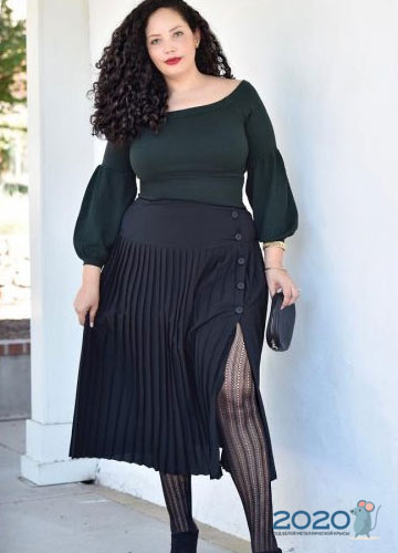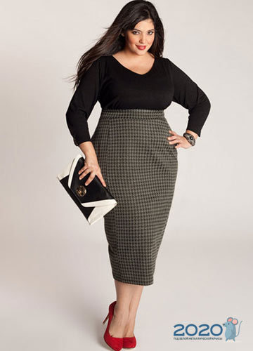 Im Trend, aus dichten, gepflegten Stoffen: eng anliegende Strickwaren, Leder, Tweed, Wolle, Denim. Der wahre Lebensretter für eine volle Frau ist ein Wickelrock, der eine spektakuläre schlanke Silhouette bildet.