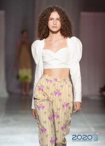 Im Laufe mehrerer Saisons verliert die modische Asymmetrie nicht an Boden und in der Saison Frühjahr-Sommer 2020 werden solche Blusen wieder auf dem Höhepunkt der Popularität stehen, wie zahlreiche Fotos der hellsten Shows der Saison beredt bezeugen.