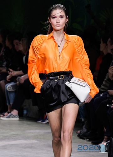 Im Laufe mehrerer Saisons verliert die modische Asymmetrie nicht an Boden und in der Saison Frühjahr-Sommer 2020 werden solche Blusen wieder auf dem Höhepunkt der Popularität stehen, wie zahlreiche Fotos der hellsten Shows der Saison beredt bezeugen.