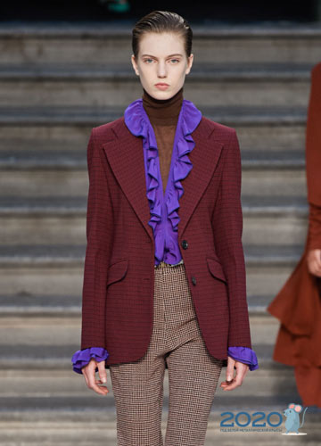 Unter den ungewöhnlichen Modellen des Jahres 2020 sind die modischen Blusen von Burberry hervorzuheben, die den Trend zu Umhängen und Poncho zeigen. Ein solches außergewöhnliches Kleiderschrankelement kann das Highlight eines stilvollen Bürobogens sein oder den Look für ein romantisches Date ergänzen.