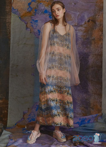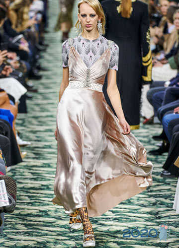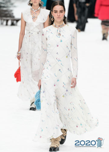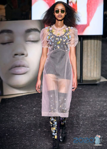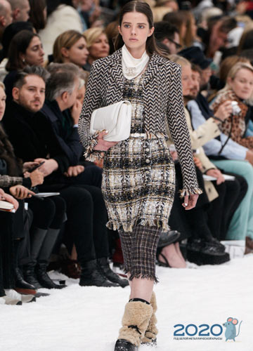 Auf den Laufstegen der Modehauptstädte der Welt werden in der Saison Modebögen angeboten Herbst-Winter 2019-2020 Kombinieren Sie brutale, massive Stiefel, Sneakers, Pelzstiefel und Plateauschuhe nicht nur mit Jeans, kurzen Shorts und weiten Hosen, sondern auch mit leichten Kleidern. Designer glauben, dass bewusst massive Schuhe, als ob sie dem Kontext des Hauptbildes entkommen, Zärtlichkeit und Weiblichkeit perfekt betonen.
