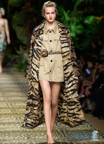 Der zweite Druck, der die Handfläche eindeutig mit Blumen und Schmetterlingen teilt, ist ein Animalist. Modische Frühlingsmäntel mit einem Bild der Haut eines Leoparden, Tigers, Schneeleoparden oder Zebras werden zum unbedingten Trend des Jahres 2020.