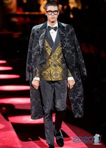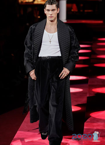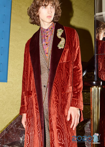 Luxuriöse barocke Samtregenmäntel waren keine Überraschung. Samt wird jetzt aktiv in der Männermode verwendet und fügt Bilder von zurückhaltendem Chic und Glamour hinzu. Viele Stylisten bieten interessante Gesamtbögen mit gleichfarbigen Samtartikeln an.