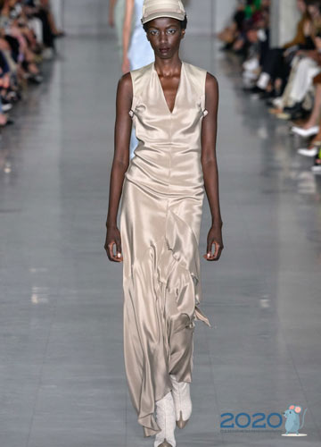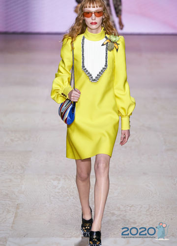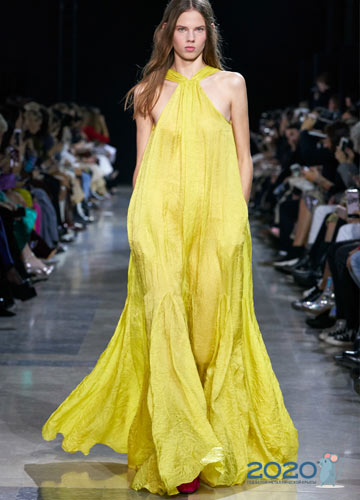Das Farbschema der Saison ist recht umfangreich und umfasst farbenfrohe, leuchtende Farben (gelb, orange, scharlachrot, grün, blau). Das Highlight eines einfachen Kleides sollte die Textur des Stoffes selbst sein. Deshalb bieten Designer im Jahr 2020 Modefans an, auf Satin, Leder, durchscheinenden Tüll sowie natürliche Stoffe wie Seide oder Leinen zu achten.