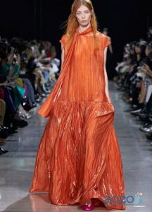 Ein absoluter Favorit der Abendmode der kommenden Saison wird ein langes Kleid mit freiem Schnitt sein. Solche Modelle gibt es bei Rochas und Marc Jacobs.