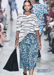 Tiefer Ausschnitt ist der Trend von 2020 und bei T-Shirts ist dieser Modetrend auch uninterpretiert. So präsentierte Louis Vuitton auf dem Laufsteg ein stilvolles Modell in weißen und grünen Streifen, und Miu Miu bietet an, einen einladend angelehnten Ausschnitt zu kreieren, um den zusätzlichen Knopf zu lösen.