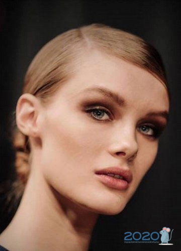 Helle Schattierungen, die von Meistern beim Schminken mit der Akt-Technik verwendet werden, sorgen für einen gleichmäßigen, natürlichen Farbton im Gesicht. Wenn in den vergangenen Saisons eine Tendenz zur Blässe bestand, können und müssen Sie im Winter 2019-2020 dem nackten Make-up wie auf dem Foto ein wenig Rouge hinzufügen.