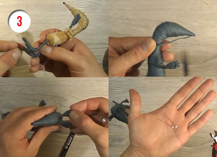 2. Der Knüppel für die Beine wird an einem Ende gebogen, so dass ein „Tropfen“ entsteht. Dies ist besonders wichtig für die Hinterbeine, da unsere Ratte sicher stehen muss. Wir fetten die gebogenen Drahtenden mit Heißkleber ein und legen drei kleine dünne Drahtstücke darauf. Das sind Krallen. Wir nehmen einen Wollfadenball und beginnen, die Pfotenspitzen zu wickeln. Vergessen Sie nicht die Krallen.