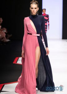 Der extravagante asymmetrische Schnitt bleibt relevant. Solche modischen Neujahrskleider werden an den Feiertagen des Jahres 2020 nicht nur durch die Asymmetrie einzelner Elemente, sondern auch durch eine ungewöhnliche Stoffkombination auffallen, die einen interessanten Mehrschichteffekt erzeugen wird.