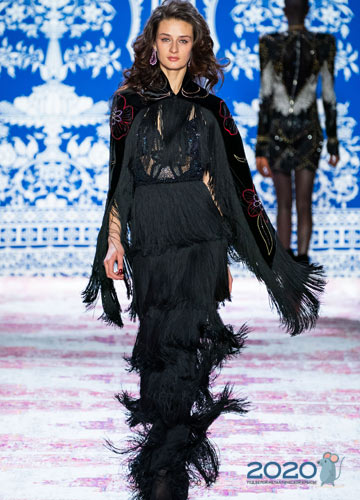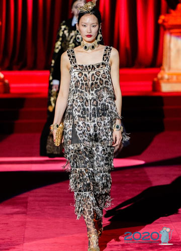 Ein modisches Kleid, reich verziert mit mehreren Fransenreihen, ist ein exquisiter Luxus mit einem leichten Retro-Touch, der an die Mode der 20er Jahre des letzten Jahrhunderts erinnert. Moderne Modelle haben jedoch ihre eigenen Eigenschaften. In den 2020-Kollektionen sollten Fashionistas auf Dolce & Gabbana-Modelle achten, bei denen der Rand einen spektakulären Leoparden-Print bildet, sowie auf eine stilvolle schwarze Schleife von Naeem Khan, ergänzt durch einen Umhang im gleichen Stil.
