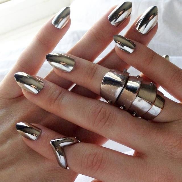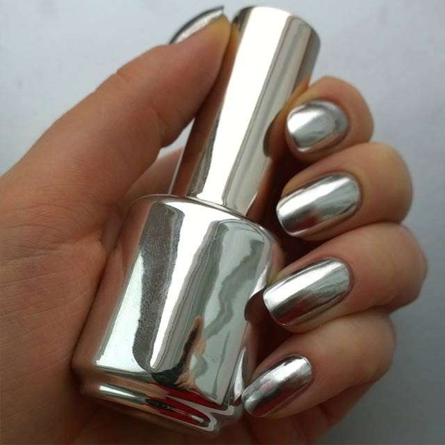 Kombinieren Sie die Neujahrs-Maniküre in den Farben "Silber" oder "Metall" nicht mit grauen Outfits für 2020. Aber für ein weißes, schwarzes oder blaues Kleid passen solche Nägel perfekt.