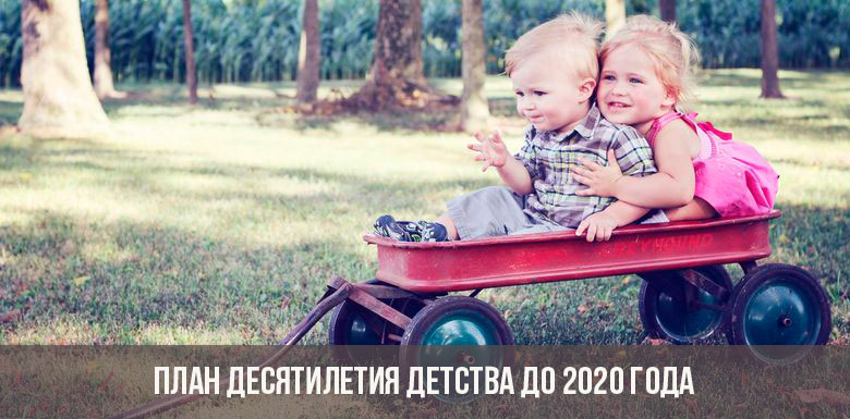 In Übereinstimmung mit dem Dekret des Präsidenten der Russischen Föderation Nr. 240 vom 29. Mai 2017 hat das Arbeitsministerium den „Plan für ein Jahrzehnt der Kindheit bis 2020“ ausgearbeitet, in dem 15 Abschnitte hervorgehoben sind, die Experten zufolge die 2012 umgesetzte nationale Strategie für Kinder fortsetzen sollen 2017 Jahre.