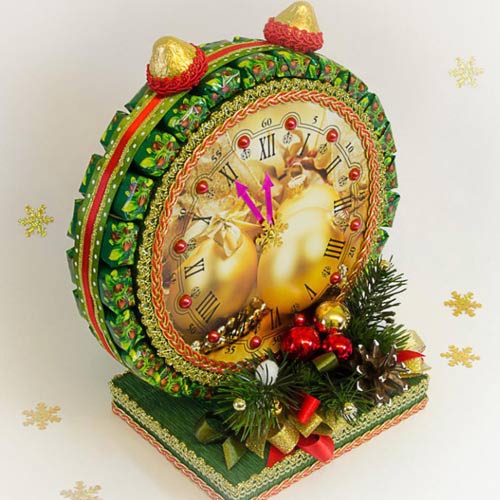 Neujahrsthemen sind Uhren, die 23:55 zeigen. Fünf Minuten vor Neujahr ist die besorgteste Zeit, um Wünsche zu äußern und Champagner zu öffnen. Lassen Sie uns das Handwerk in Form einer Uhr machen. Es ist sehr einfach und erfordert ein Minimum an Materialien.