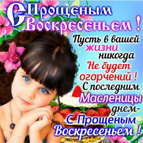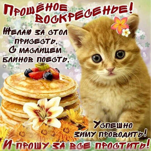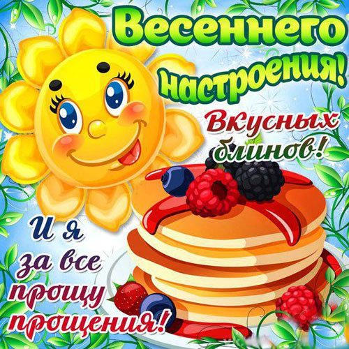 Da der Sonntag der Vergebung der siebte Tag von Maslyana ist, sind Postkarten mit einer Erwähnung dieser Tatsache, dem Wunsch nach köstlichen Pfannkuchen und möglicherweise einer Einladung zum Abendessen angebracht.