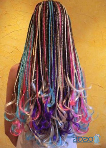Der Modetrend 2019 wird in der kommenden Saison nicht an Relevanz verlieren. Dank der Verwendung heller Strähnen können mit dieser Technik auch Mädchen mit mittellangen Haaren lange Zöpfe tragen. Eine solche Frisur zu kreieren ist sehr einfach. Es genügt, vorgefertigte Schlösser in der gewünschten Farbe zu kaufen und wie auf dem Foto gezeigt zu Zöpfen zu flechten.