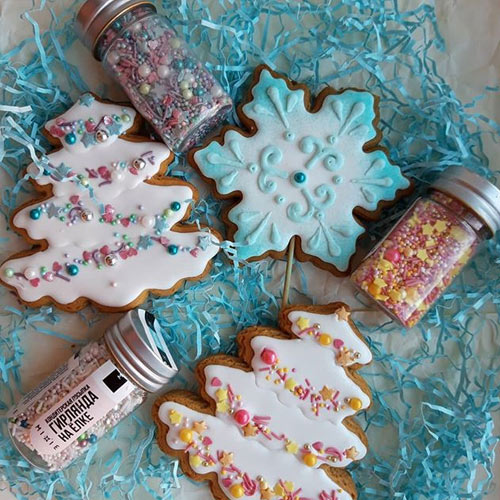 Den Teig mit einer ausreichend dünnen Schicht (5 mm) ausrollen und die gewünschten Figuren ausschneiden. Sie müssen bei einer Temperatur von 170-180 Grad für 10-15 Minuten gebacken werden. Trocknen Sie die Lebkuchen nicht sehr. Sie müssen weich bleiben. Lassen Sie sie vollständig abkühlen und dekorieren Sie sie anschließend. In dieser Phase können Sie in Kreativität eintauchen. Verwenden Sie vorgefertigtes oder selbstgemachtes Zuckerguss. Um die gewünschte Farbe der Glasur zu erhalten, fügen Sie Farbstoffe hinzu, jedoch nur Lebensmittelfarben. Wie man die Lebkuchenplätzchen für das neue Jahr 2020 dekoriert, sehen Sie auf dem Foto.