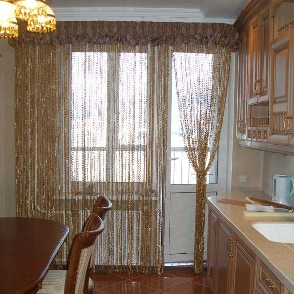 Eine weitere ungewöhnliche Lösung für kreative Menschen, die eine außergewöhnliche Lösung für den Innenraum suchen. Designer haben bewiesen, dass solche Vorhänge im Jahr 2020 nicht nur im Wohnzimmer, sondern auch in der Küche sicher gekauft werden können, indem sie als Monodekor verwendet oder andere moderne Modelle mit Fäden kombiniert werden.