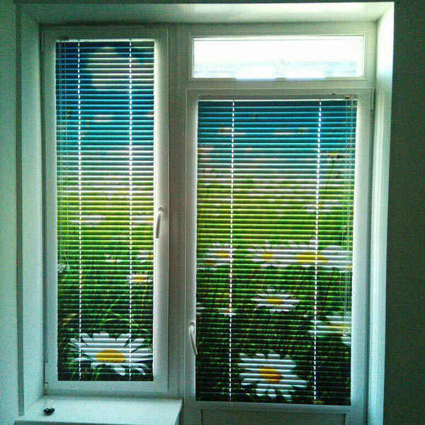 Sie können Schönheit und Zweckmäßigkeit kombinieren, indem Sie horizontale Jalousien mit einem Muster bestellen oder die Ebene mit einem schönen Tüll mit einem hellen Aufdruck ergänzen.