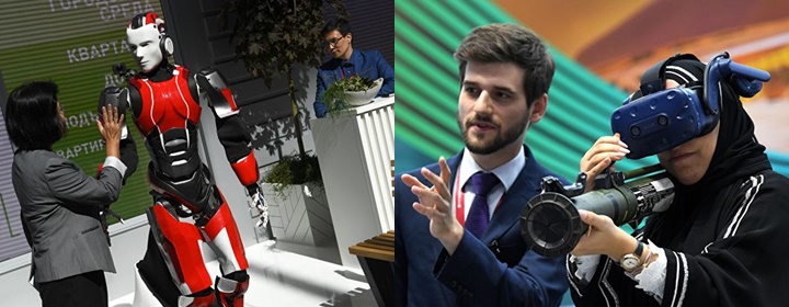 Eine der auf der Präsentation vorgestellten innovativen Entwicklungen war der Pythagoras-Roboter. Ein Virtual-Reality-Helm, eine VR-Brille usw. wurden ebenfalls vorgestellt.