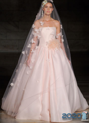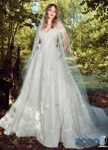 Ein bedingungsloser Trend im Jahr 2020 werden weiße Brautkleider (wie auf dem Foto) sein, die Reinheit und Unschuld verkörpern und die Zärtlichkeit und Jugend der Braut betonen.