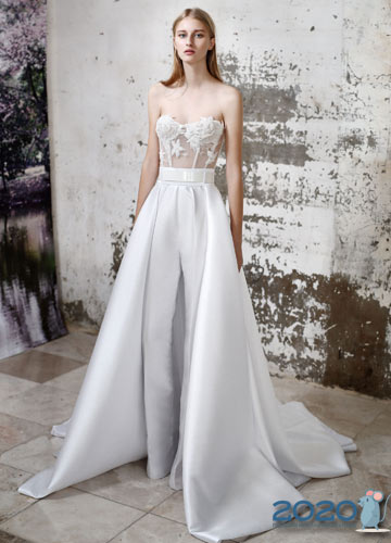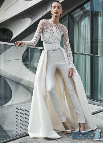 Ein eleganter Hosenanzug ist seit langem eine Alternative zu einem Hochzeitskleid, und 2020 wird es definitiv Mädchen geben, die ein solches Image bevorzugen. Es ist erwähnenswert, dass es perfekt für eine Zeremonie im europäischen Stil oder für eine maßgeschneiderte Jugendhochzeit ist. Das Kostüm kann auch als zweites Hochzeitsoutfit gekauft werden. Zum Beispiel wird die Braut bei der Hochzeit ein prächtiges Kleid tragen. Und für die Party selbst wird es sich in praktischere und bequemere Kleidung zum Tanzen und für andere Unterhaltungszwecke verwandeln.