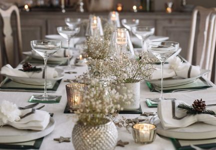 Für die Dekoration des Interieurs empfehlen die Stylisten, so viel Weiß wie möglich zu verwenden: eine lakonische Tischdecke ohne Dekor, Servietten, Geschirr, Kerzen. Silberne Akzente verwässern die Sterilität von Weiß und machen die Portion elegant und raffiniert. Es kann sein: