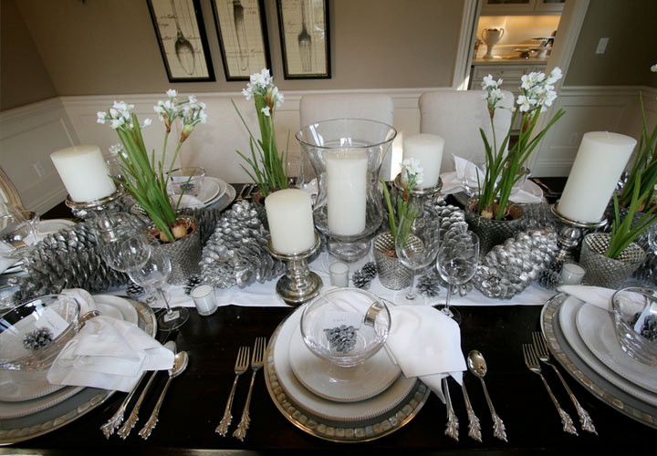 Für die Dekoration des Interieurs empfehlen die Stylisten, so viel Weiß wie möglich zu verwenden: eine lakonische Tischdecke ohne Dekor, Servietten, Geschirr, Kerzen. Silberne Akzente verwässern die Sterilität von Weiß und machen die Portion elegant und raffiniert. Es kann sein: