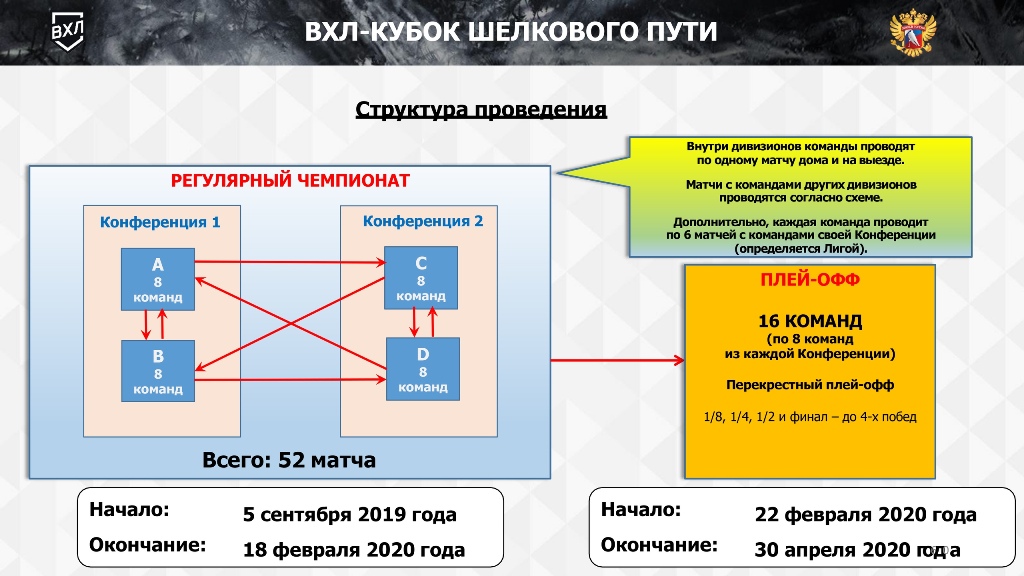 - Weitere 6 Spiele werden sowohl auf dem Spielfeld als auch auf dem Eis des Gegners mit den Vereinen der eigenen Division ausgetragen. Die Gewinner werden die Besitzer des Silk Road Cup.